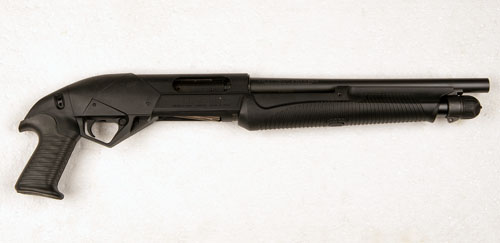 A DEACTIVATED 12-BORE MULTI-SHOT PUMP-ACTION TACTICAL SHOTGUN SIGNED BENELLI, MODEL SUPER-NOVA, serial no's. Z338381 & V3665583 recent, with unsighted 14in. cylinder-choked barrel, black rubber pistol grip and blacK ABS plastic armour panels, 26in. overall length