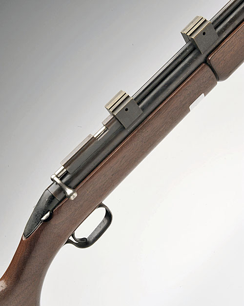 A .20 (5mm) MULTI-PUMP PNEUMATIC AIR-RIFLE SIGNED SHERIDAN, MODEL 'BLUE-STREAK', serial no. 8691H, with blackened brass 19in. barrel fitted with intermount blocks, brass pump-housing, bolt action receiver, walnut stock and forend, some wear to finish throughout
