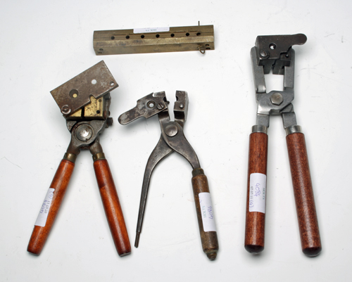A LOT OF FOUR BULLET MOULDS, including a .32 Winchester Center Fire mould with sprue cutter, a 54-bore Ideal bullet mould with R.C.B.S. handle with sprue cutter, a .599 bullet mould with sprue cutter & a six ball gang mould