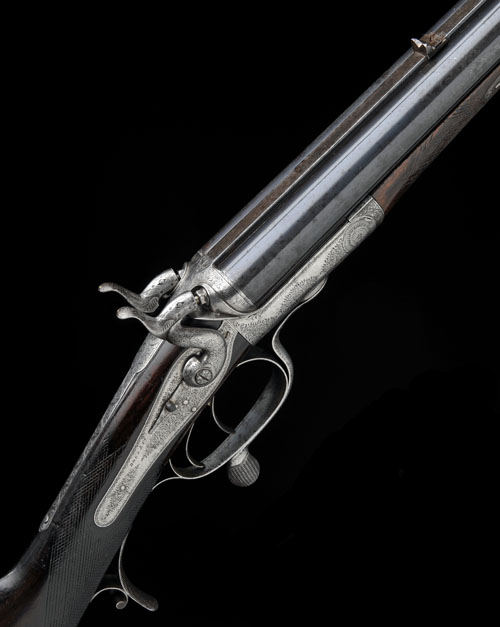 28in. black powder only barrels with Henry rifling, raised matt rib with open sights and folding leaf sight for 50 and 100 yards, bead foresight, under rib engraved 'BOSS & CO. 73. ST. JAMES'S STREET. LONDON.' Jones patent rotary-underlever, carved percussion fences, rebounding back-action locks with bolted dolphin hammers, triggerguard forming skeletal steel pistolgrip, fine border and acanthus scroll engraving, brushed bright finish overall, 14 1/4in. boldly-figured stock including chequered steel buttplate, sling eyes, fore-end with replacement wood (with crack) and finial, weight 9lb. 14oz.