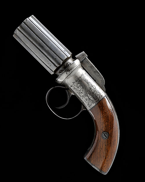 circa 1850, with 3in. barrel cluster (traces of colour), numbered barrels, floral sprigs engraved at muzzles, safety notches at rear for hammer, scroll-engraved rounded frame of standard form, vacant name banner to left hand side, smooth walnut grips, scroll engraved back-strap, butt-cap and trigger-guard