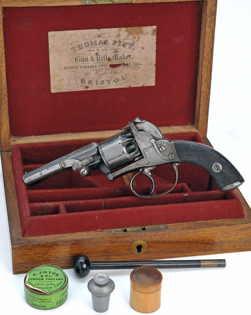 circa 1855, loosely of Webley Bentley type, probably Belgian, with 3 1/2in. octagonal sighted barrel, banded at the muzzle, plain cylinder with rope-band engraved to front edge, Birmingham proofs, half top-strap with rear-sight notch, border-lined frame with external spring hammer safety, spur-less hammer, slim chequered walnut grips, border-lined trigger-guard with double-action only trigger, hinged rammer mounted on left hand side of barrel (traces of colour throughout), TOGETHER WITH its original oak transit case, lined in red baize, paper label in lid for 'THOMAS PITT, 43 HIGH ST, BRISTOL' and including a number of accessories including an ebony loading rod, box-wood spare nipple box, small alloy oil bottle and tin of 'Joyce's' caps, the lid with vacant circular brass escutcheon (some compartments loose)
