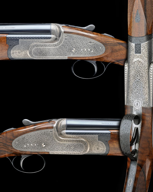 27 1/2in. nitro barrels with 9mm ventilated matt top-rib and side-ribs, over barrel engraved 'IVO FABBRI - BRESCIA - . VACUUM ARC REMELTING STEEL.', 2 3/4in. chambers, bored approx. 1/4 and 3/4 choke, hold-open toplever, manual safety, cocking-indicators, the action, lockplates and furniture profusely engraved with fine acanthus scrollwork interspersed with floral bouquets and with beaded borders, the triggerplate signed 'N. Fabbrizioli. inc.', bright finish, 14 5/8in. highly-figured stock, weight 7lb. 2oz., in its Nizzoli lightweight leather case