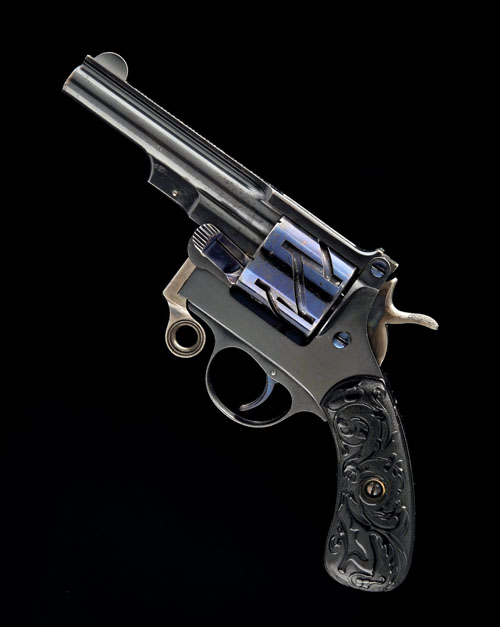 circa 1880, with blued 3 1/2in. barrel, the sighting rib signed 'GERB. MAUSER & CIE. OBERNDORF A/N. WURTTEMBERG, 1878', crescent fore-sight, notch rear-sight, peacock-blued cylinder with characteristic 'zig-zag' slots, plain frame with cylinder safety mounted on left hand side, swept-back gutta-percha grips with raised vines and mythical beasts, colour-hardened hammer and opening latch, the whole in fine order with almost all original finish remaining, TOGETHER WITH a period full-flap pig-skin holster and spare safety catch