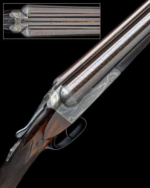 31in. nitro proved fine damascus barrels, broad rib gold-inlaid 'C.G. BONEHILL MAKER LONDON.', 2 7/8in. chambers, bored approx. 1/4 and true cyl. choke, large frame treble-grip action incorporating C.G. Bonehill and W.J. Matthews lever cocking patent 1952 of 12th May 1880, use number 443, the top of the standing breech with oval details gold-inlaid 'BONEHILL MATTHEWS' 'HAMMERLESS GUN', and 'ECLIPSE', automatic safety with gold-inlaid 'SAFE' detail, fine scroll engraving, the underside with a brace of pheasant, the triggerguard with two pointers, retaining traces of colour-hardening and finish, 14 3/8in. figured stock with ornate chequering borders, the fore-end decorated en suite, Deeley & Edge patent fore-end release catch and with horn finial, weight 8lb. 2oz.