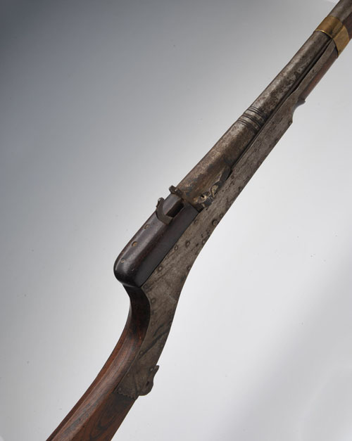A 20-BORE MATCHLOCK SINGLE-SHOT JEZAIL MUSKET, late 19th century, from the Sind region of Pakistan, with 39 3/4in. iron barrel with flared muzzle, plain full-stock with iron re-inforcing panels at action sides, blade trigger and sheet brass barrel-bands