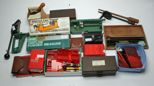 A QUANTITY OF RELOADING EQUIPMENT, including a Lyman Universal Case Trimmer, RCBS 10.10 scale (parts missing), RCBS Uniflow Powder Measure, RCBS Press, Lee 7mm Reloading Kit, Lee 223 Reloading Kit, Lee 375 Reloading Kit, Lee 308 Reloading Kit, Lee 7mm Reloading Kit, Bushnell Professional Sighter12 bore cleaning kit, together with a tub of various other gun related parts