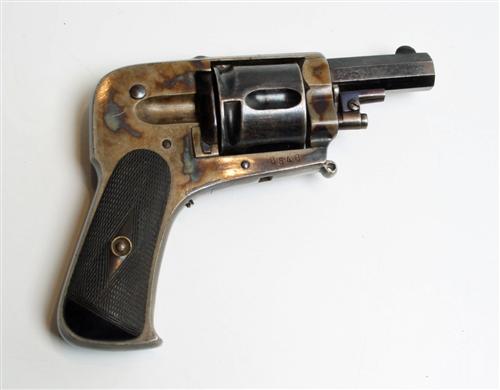 Belgian, circa 1875, with blued octagonal, sighted, 1 1/2in. barrel, blued blind-fluted cylinder with rear locking notches, colour-hardened frame with side safety, black hard-rubber chequered grips, folding trigger, swinging ejector-rod housing (rod missing), the whole retaining virtually all its original colour