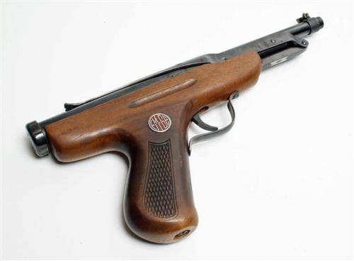 A .177 SPRING-PISTON AIR-PISTOL SIGNED EMGE, MODEL ZENIT, no visible serial no. possibly pre-war, with blued 5in. barrel, over-chamber cocking-lever, walnut one-piece grip with pressed chequered panels, much original finish.