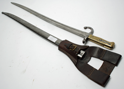 A BAYONET FOR THE CHASSEPOT RIFLE, French, circa 1875, complete with its scabbard and leather frog (metal surfaces cleaned and polished)