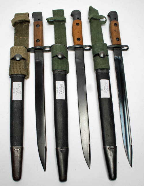 THREE BAYONETS FOR THE INDIAN SMLE RIFLE, including one example modified from an '07 Pattern, all with leather scabbards and webbing frogs