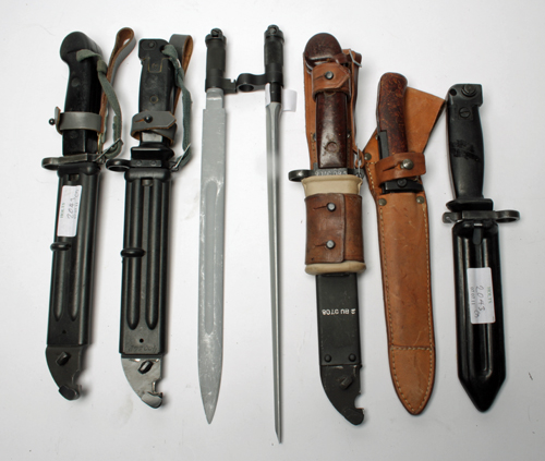 A COLLECTION OF SEVEN EASTERN BLOCK BAYONETS, including a Czech varient AK type, two AK models with black plastic wire-cutting scabbards, a non wire cutting version, a brown bakelite handled version and two folding types for permanently attaching to SKS and similar rifles