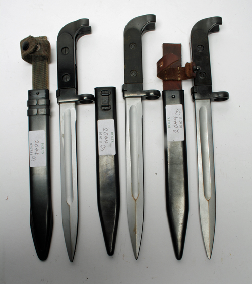 THREE ASSORTED BAYONETS FOR THE AK47 RIFLE, all with scabbards, two with frogs Estimate £30-50