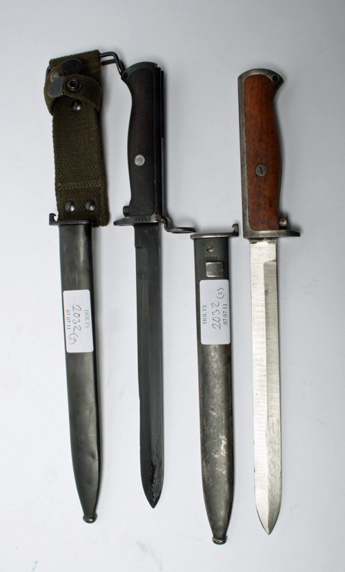 TWO NORWEGIAN BAYONETS, the first for the Krag M1894 rifle, the second the same but modified to fit the M1956 SLK (better known as the M1 Carbine), both examples with scabbards, the last with belt attachment