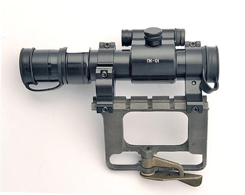 A RUSSIAN ISSUE 'RED-DOT' SIGHT AND MOUNT, believed for an AK47 assault rifle, with camouflaged carry-bag, appearing unused