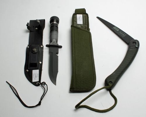 A SURVIVAL KNIFE AND A FOLDING SAW, the first with 6in. saw-back blade, hollow plastic handle with contents and a compass in the pommel, in its sheath appearing unused, the second by 'BAHCO' with 8in. blade, in a British SA80 bayonet frog, again appearing unused