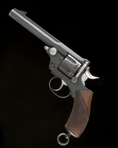 circa 1880, with octagonal 5 3/4in. barrel, the raised sighting rib signed 'HUGHES & SONS, BIRMINGHAM', blade fore-sight, notch rear-sight, fluted cylinder plain hinged frame with twin 'Pryse' levers (re-numbered A12W), chequered walnut one-piece grip, iron butt-cap with lanyard ring, refinished throughout