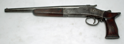 A .410 (2 1/2IN.) SINGLE-SHOT HAMMER SHOT-PISTOL SIGNED 'CRESCENT ARMS CORP USA', serial no. 1982, with 12 1/4in. barrel (proved 2011), steel frame, wood saw-back grip with provision for shoulder-stock (missing), finish worn