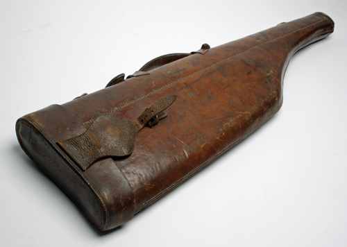 A LEG-OF-MUTTON LEATHER GUNCASE, for up 31in. barrels, lined with blue baize, brass lock (key missing)