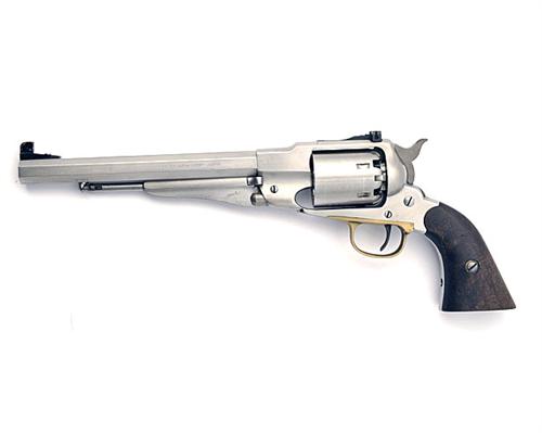 A REPRODUCTION .44 B/P PERCUSSION SIX-SHOT SINGLE-ACTION REVOLVER SIGNED EUROARMS, MODEL REMINGTON ARMY, serial no 115331 target model in stainless steel with 8 in. barrel and adjustable sights, appearing little used