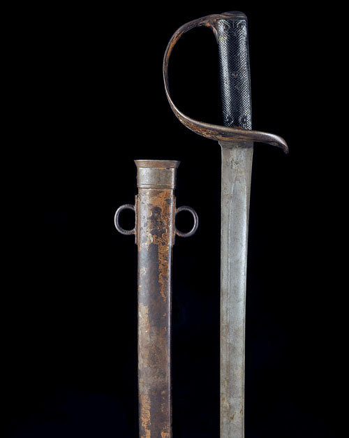 * AN 1845 BRITISH OFFICERS INFANTRY SWORD, with unsigned blade, large basket with fixed inner guard and 'VR' crown and cypher, retaining its steel scabbard with twin suspension rings (blade cleaned and polished with some loss to detail, other minor losses throughout)