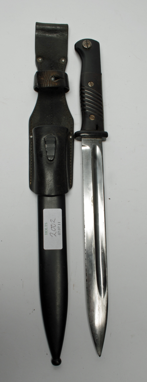 ** A GERMAN MODEL M98 BAYONET FOR THE K98K RIFLE, signed 'E. HORSTER' and dated for 1938, with its matching number scabbard and black leather frog, re-finished for parade use