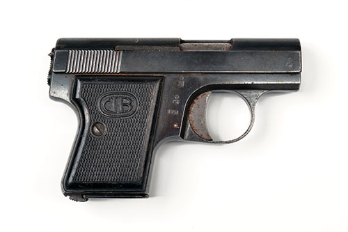 ** A 6.35mm (.25ACP) SEMI AUTOMATIC VEST PISTOL SIGNED BERNADELLI, serial no. 42809, for 1951, with 2in. brushed bright barrel, blued sighted slide, blued iron frame and chequered black plastic grips