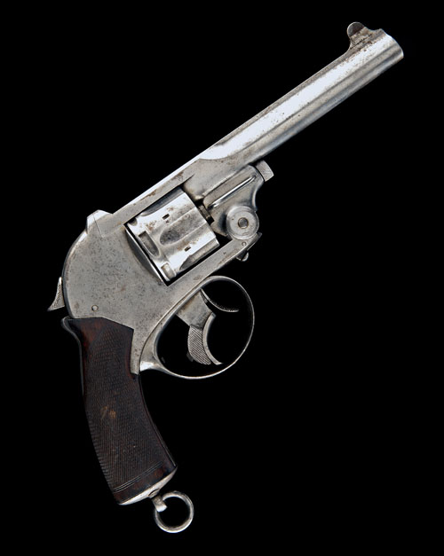 circa 1887 to Schlund's patent, 6in barrel with sighting rib signed 'KYNOCH GUN FACTORY ASTON', the top-strap signed 'PATENT MODEL', wire holster-guides (possibly later), plain hinged frame marked 'CAL 476', sliding barrel release to rear, fluted cylinder, one-piece chequered walnut grip (small loss to left hand side), butt-cap with lanyard ring and large over-sized trigger-guard with twin triggers and de-cock device (external surfaces worn and stripped of finish) TOGETHER WITH its period leather holster (poor condition, stitching undone)