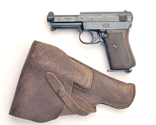 ** A 7.65mm (.32ACP) SEMI-AUTOMATIC PISTOL SIGNED 'MAUSER', MODEL '1910/14' serial no. 304963 circa 1930, with 3 1/2in. barrel, blued slide and chequered walnut one-piece grip, the whole retaining a fair amount of original finish TOGETHER WITH a period leather full-flap leather holster