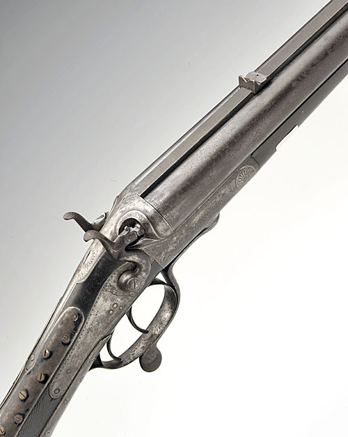 * J. & W. TOLLEY .577 (BLACK POWDER) DOUBLE-BARRELLED ROTARY-UNDERLEVER HAMMER RIFLE, serial no. 6791, 26in barrels with file-cut matt rib, blade fore-sight, rear sight of one standing and one folding leaf, the tubes engraved 'J. & W. TOLLEY. MAKERS. 1. CONDUIT ST. REGENT ST. LONDON. W.' (some discolouration to barrels), Jones patent rotary-underlever, carved percussion fences, the right of the action marked 'CHARGE 6Drs', non-rebounding back-action locks (one hammer replaced, firing pins removed), border engraving, 14 1/2in. stock with steel buttplate, sling eyes, stock cracked and repaired with steel strengthening plates at the hand