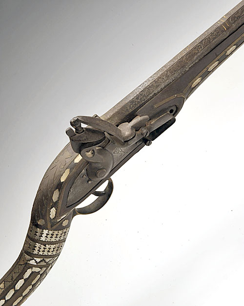 * A 32-BORE PAKISTANI FLINTLOCK JEZAIL, circa 1860 with 35 1/2in octagonal barrel, chased decoration at the breech end, earlier European lock, 'Sind' style full-stock with profuse inlaid mother-of-pearl decoration in a chequerboard and lozenge fashion, three brass barrel-bands, iron ramrod (the whole worn and stained)