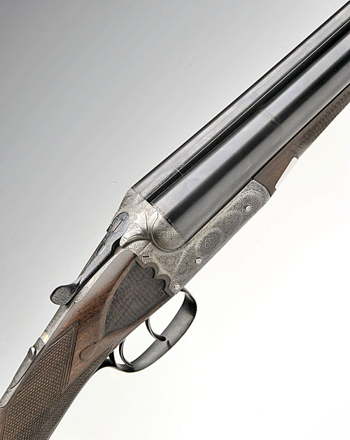T. NEWTON 12-BORE BOXLOCK EJECTOR, serial no. 16541, 30in. sleeved nitro barrels, 2 3/4in. chambers, bored approx. full choke in both, scroll-backed treble-grip action, carved stylised acanthus leaf fences, automatic safety with gold-inlaid 'SAFE' detail, bouquet and scroll engraving, 14 1/4in. figured stock with chequered recessed side panels, bolstered fore-end wood with repair