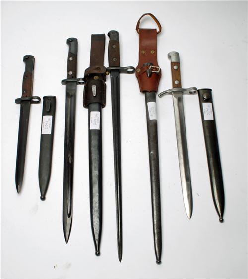 FOUR UNIDENTIFIED BAYONETS, all early to mid 20th century, all with scabbards, two with double-edged blades, two with leather frogs