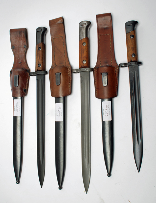THREE BAYONETS FOR THE CZECH VZ24 RIFLE, all in good condition with scabbards and leather frogs