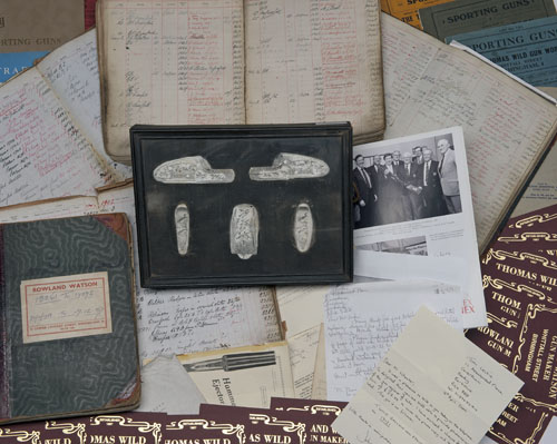 the whole presenting an opportunity to acquire one of the many respected makers of the Birmingham gun trade, the Lot comprises full legal entitlement to the company name, full certificates of incorporation and registration lodged with Companies House, a letter from R.H.G. Watson on the occasion of his retirement announcing the passing of ownership to Barry King, Esq. dated March 1987, interesting plaster casts of a Watson sidelock engraved by William Woodroffe circa 1921 showing the two lockplates, floorplate and triggerguard, the whole set in glazed frame, five Rowland Watson leather hard-bound day books showing all orders from gun no.1135 to 22664 corresponding to the years 1894 - 1997, the last order being for a .470 double rifle for an American client, together with numerous items of ephemera pertaining to the company and a quantity of both Watson and Wild trade labels.