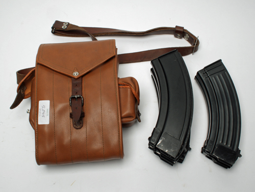 FIVE ASSORTED STEEL MAGAZINES FOR AK TYPE RIFLES, together with a cleaning kit and ancilliaries, all contained in an issue leatherette shoulder bag