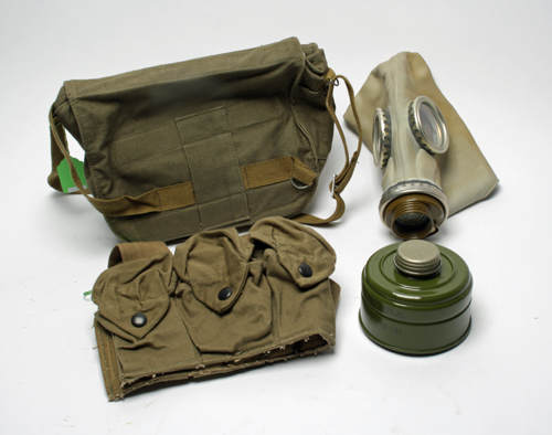 AN EASTERN BLOCK GAS-MASK IN ITS CANVAS CASE,