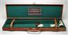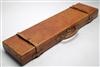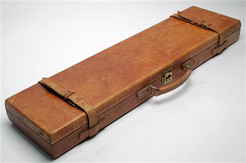 A TAN LEATHER SINGLE GUNCASE, fitted for 30in/ barrels, lined with green baize, brass lock (key missing), interior lid with a copy of an Army & Navy trade label