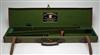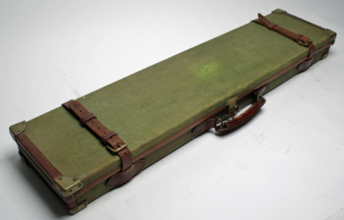 A BRASS-CORNERED GREEN CANVAS & LEATHER TAKE DOWN RIFLE CASE, lined with green baize, brass lock (including key), with modifications to boxing, a Holland & Holland trade label on the interior lid, straps & handle in good order