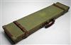 A BRASS-CORNERED GREEN CANVAS & LEATHER TAKE DOWN RIFLE CASE,