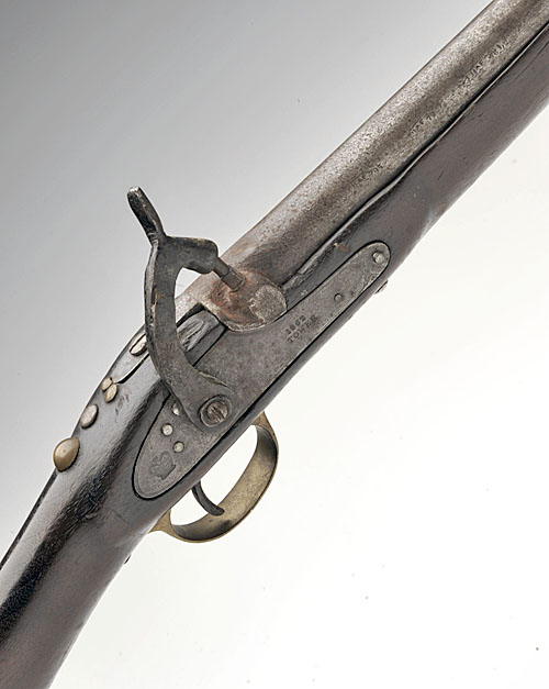 AN 18-BORE PERCUSSION COLONIAL CARBINE, circa 1870, formed from an Indian manufactured Pattern 53 carbine/musket with replacement hammer and native tack decoration to stock, worn overall