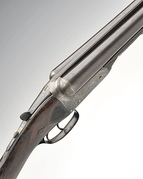 T. HEPPLESTONE 12-BORE BOXLOCK NON-EJECTOR, serial no. 7486 (on barrel loop only), 26 1/8in. nitro reproved damascus barrels engraved 'REMODELLED BY WILLIAM FORD. 15 ST MARYS ROW. BIRMINGHAM' (shortened), 2 1/2in. chambers, bored approx. imp. cyl. in both, treble-grip action, automatic safety with gold-inlaid 'SAFE' detail, acanthus scroll engraving surrounding vignettes of game, figured stock with chequered side panels (pinned at head), bolstered fore-end with band