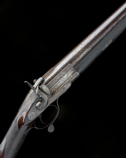 circa 1865, possibly converted from muzzle-loading, with re-browned 32 1/2in. round twist-steel barrel, scroll engraved breech and tang with twin fences, border and scroll engraved action body, border-line and scroll engraved bar-action lock with game scene in an oval at the tail, scroll engraved hammer, chequered walnut straight hand stock, iron heel-plate, scroll and border engraved trigger-guard tang, scroll engraving to the bow, 'Jones' patent under-lever opening, chequered forend with  horn 'tulip' tip (furniture and lock-plate stained and lightly worn)