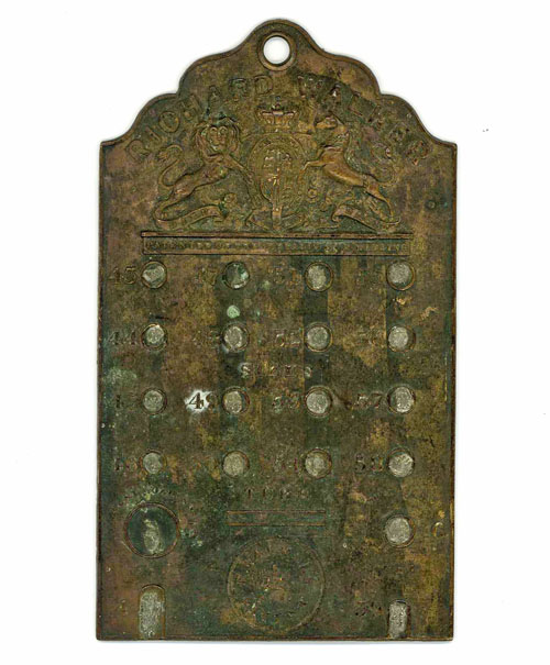 A RARE BRASS RICHARD WALKER PATENT DIE-STRUCK PERCUSSION CAP SAMPLE BOARD,