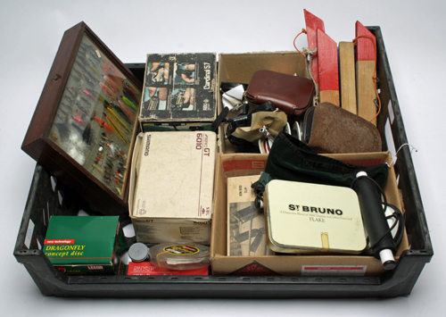 A PLASTIC CRATE OF FISHING RELATED ITEMS, including pegs, reels, line, flies, spinners, etc