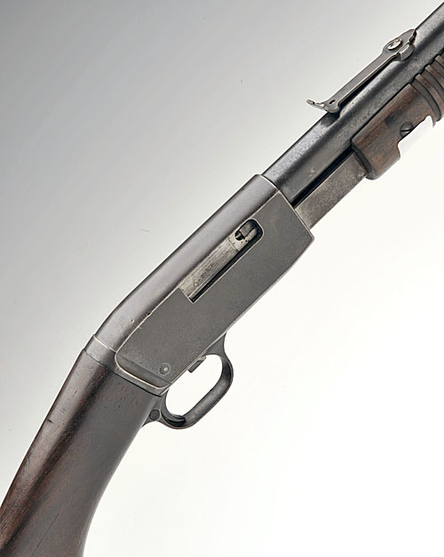A BELGIAN .22LR TAKE-DOWN PUMP-ACTION RIFLE, serial no. 64126, 21 7/8in. black powder only barrel, stock loose
