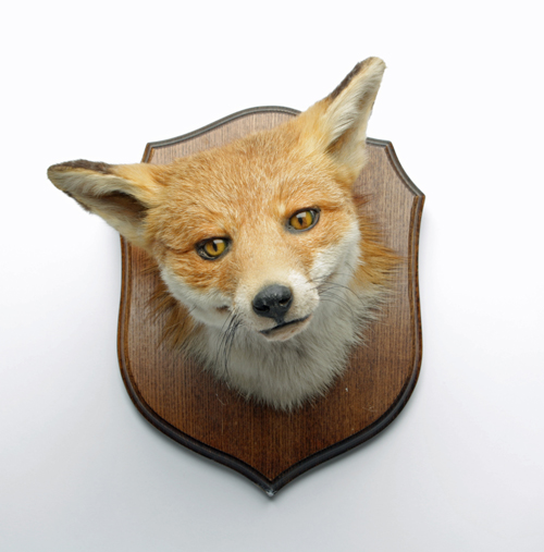 A FOX MASK, mounted on a wooden plaque Estimate £40-60