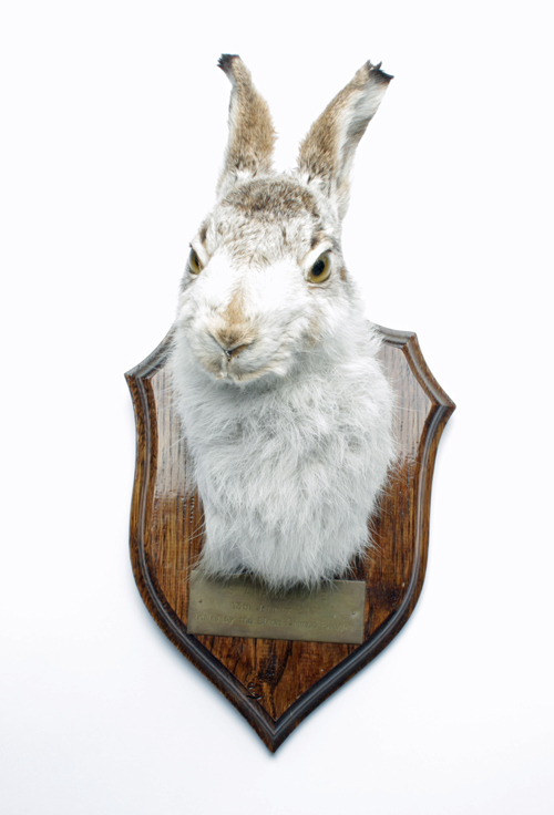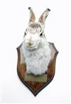 A HEAD & CAPE MOUNT OF A HARE, mounted on a wooden shield, with 'STRANGE EDGE' 13th January 2001 killed by the Black Coombe Beagles engraved on a brass plaque