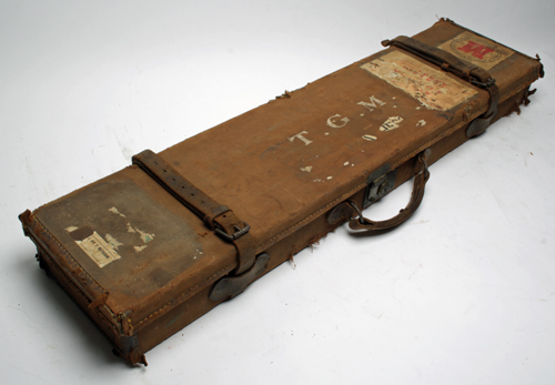 A CANVAS & LEATHER TAKE DOWN RIFLE CASE, converted from a guncase, lined with green material, brass lock (key missing), with an Army & Navy trade label on the interior lid, initialled T.G.M.