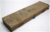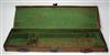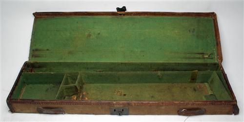 A CANVAS & LEATHER SINGLE GUNCASE, suitable for 30in. barrels, lined with green baize, brass lock (key missing), straps & handle missing